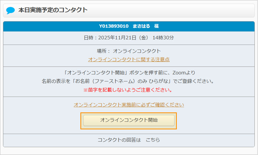 ※詳しくは日程調整画面の「オンラインコンタクトに関する注意点」から確認ください。