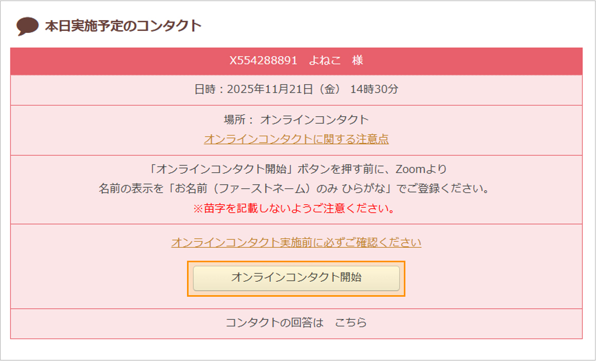 ※詳しくは日程調整画面の「オンラインコンタクトに関する注意点」から確認ください。